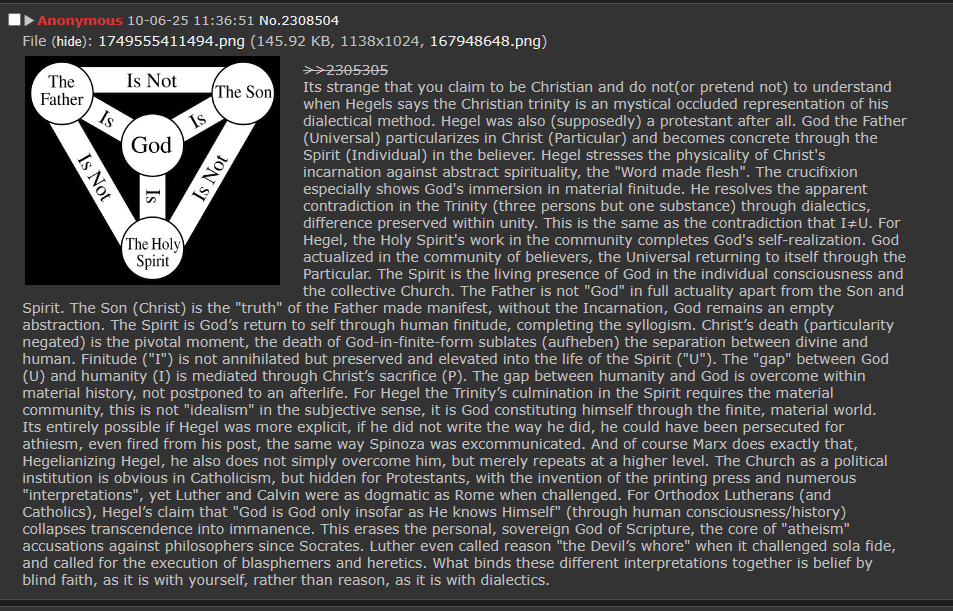 unfortunately, the mods deleted all my posts site-wide before the archive, but it appears that a debate between dialectics and positivism takes centre-stage, with accusations that i was a follower of the austrian school being spread (of course, without a shred of evidence, like today). from what i can gather, the claim was that dialectics are superior to "formal logic", so i asked for a comparison, which was never given. i only received vain repetitions as the the "idealism" of believing that A=A, and so this discussion went nowhere. if i remember correctly, this also related to the contention over price and value, since i saw price as self-grounding (A=A=A…), while the assertion of essence (i.e. value) acts as a hegelian medium between prices.