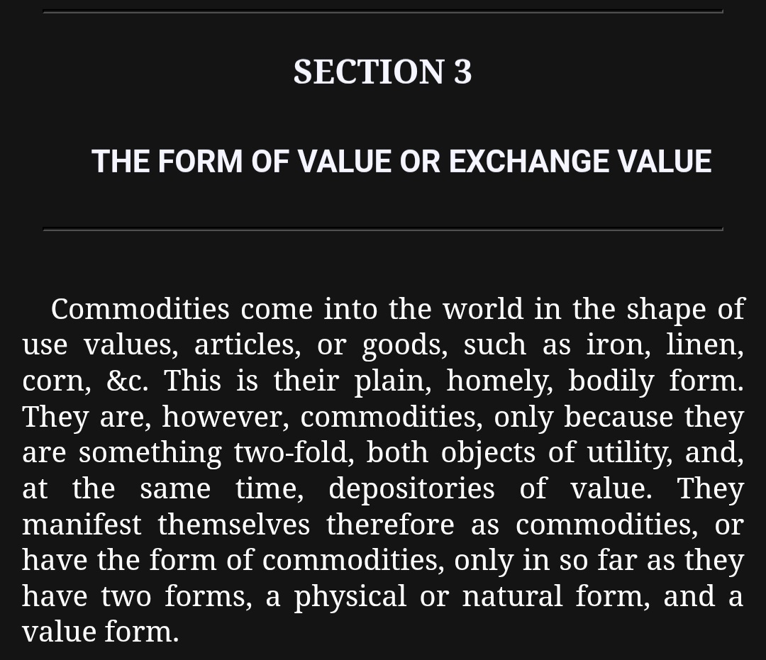 >>2622111<When, at the beginning of this chapter, we said, in common parlance, that a commodity is both a use value and an exchange value, we were, accurately speaking, wrong. A commodity is a use value or object of utility, and a value. It manifests itself as this two-fold thing, that it is, as soon as its value assumes an independent form – viz., the form of exchange value. It never assumes this form when isolated, but only when placed in a value or exchange relation with another commodity of a different kind. When once we know this, such a mode of expression does no harm; it simply serves as an abbreviation.https://www.marxists.org/archive/marx/works/1867-c1/ch01.htm#S3 >>2622118oh i see now, he does not. thanks mr smith!
