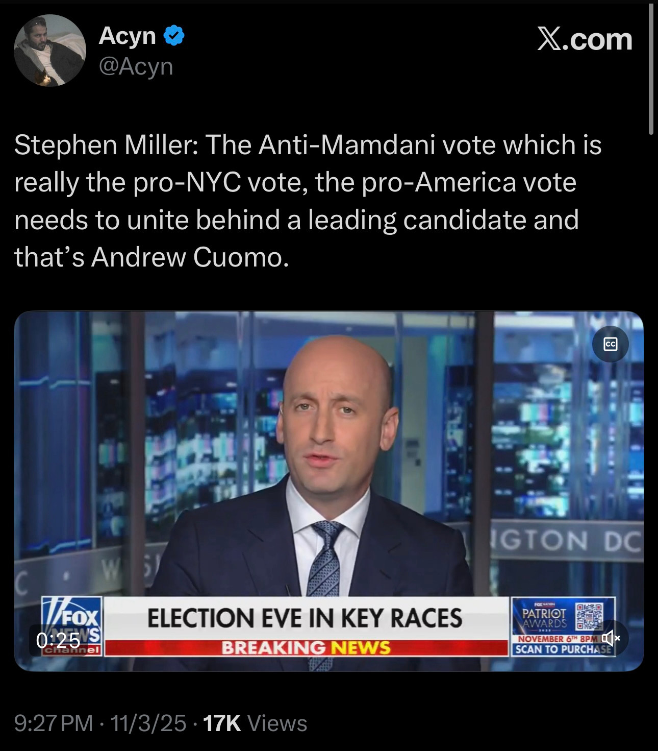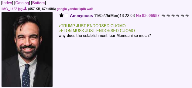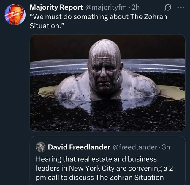 <Dick Ridin' Mamdani EditionThread for hellish discussion of the Dying Burger Reich: Things are going to continue to happen in the stupidest ways possible that no one really takes seriously, where every single person compulsively reacts with either cynical grifting or useless panic and appealing to a political system of liberal democracy that is entirely dead and irrelevant. things will continue to get gradually worse, more people will lose their jobs and homes, the most destitute and marginalized will be oppressed by state-backed domestic terrorism, but the decay will simply continue and everyone who isn't actively being imprisoned and forced into slavery or outright exterminated will simply ignore it and maintain a cognitive dissonance of believing a civil war is happening while living their lives in a mostly normal fashion. The death of the United States will be slow, painful, and insufferably annoying and stupid. 🏈 💵