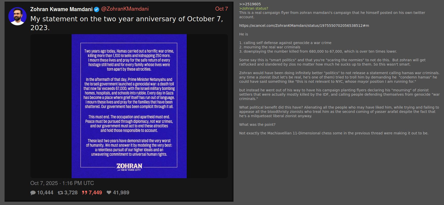 >>2549198You will watch him drop every Pro Palestinian position and never return to them. You will seal-clap for him as more chunks of his remaining platform are peeled off and he degenerates into a centrist lib. You will chastise the left again when they refuse to vote for the next Mamdani™.
