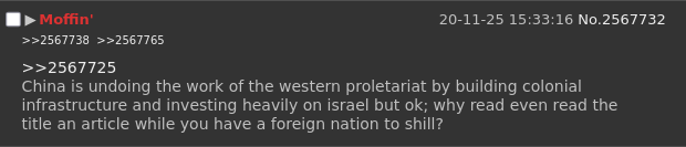 >>2567164>not going to pretend a creation of western imperialism like the Gaza genocide is on themWhat makes you think China is opposed to western imperialism when they have the same position on the Gaza genocide as Arab puppet regimes? What makes anyone think China isn't a benefactor of this imperialism when they use it as an opportunity for a quick cash grab?