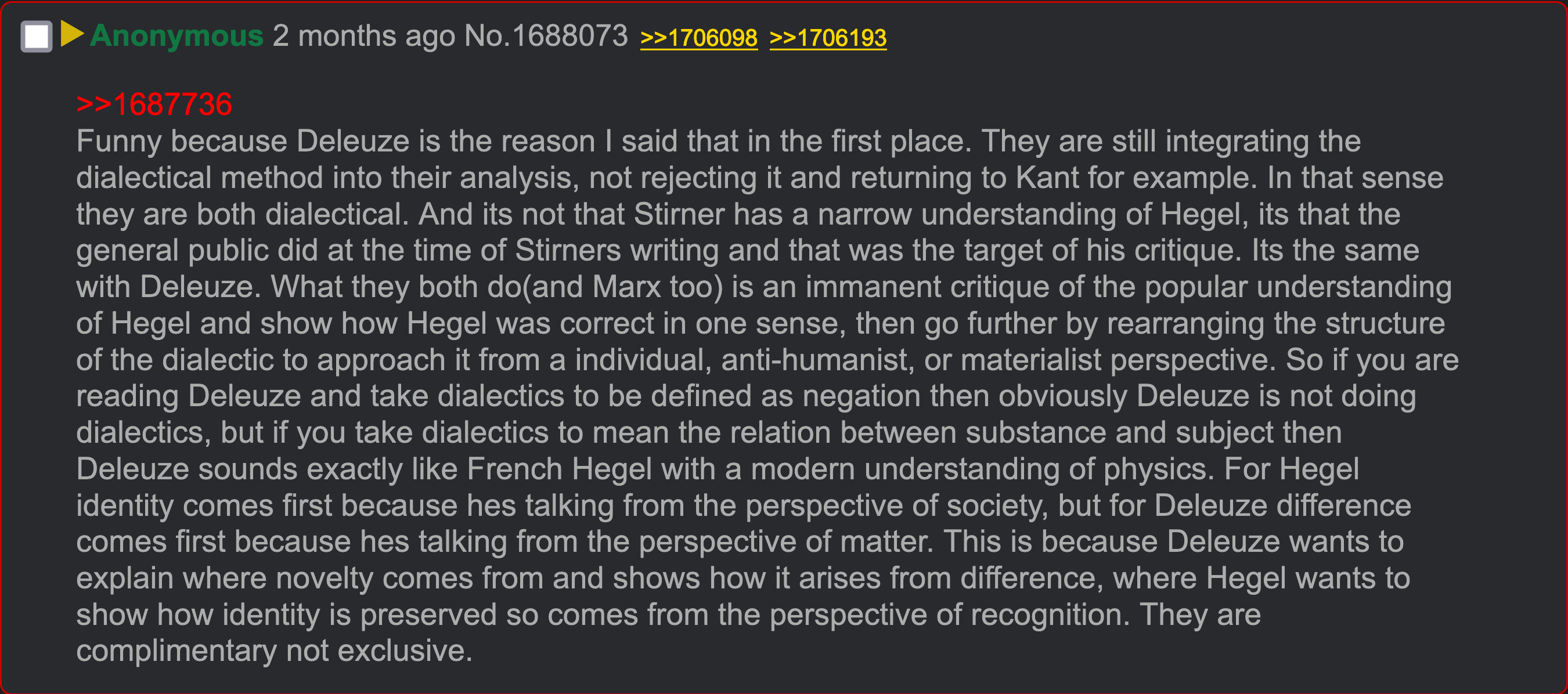 >>2549881I'm going to hazard to guess that this is from his Nietzsche book, which for the record I haven't read. As I hinted at before, I'm not much of a Deleuze guy; I'm more familiar with his middle to late period with Guittari onwards. But this is almost certainly in reference to Nietzsche's anti-historical drive. For Hegel, dialectics are necessarily steeped within–and Marx and Nietzsche alike would claim overdetermined by–the historical "spiritual" conditions (Geist) of the moment of its thought and recognition. Perhaps the core of Neitzsche's philosophical program is to explode the notion that a thinker need to rely on or respect or respond to the past whatsoever (The Gemology of Morals and The Twilight of the Idols are ostensibly arguing and doing exactly this). The Hegelian critique is this would be essentially to show that this very move by Nietzsche is itself intractable from the spirit of his moment in history; Deleuze thinks that this move is (I recall he once uses this phrase) a parlor trick.