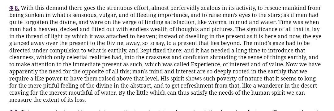 >>2550084The Antigone discussion would require too much tracing of the development of individuality in Hegel; which–and you can take this as me backing out if you wish–I'm just too sick to do at the moment. Unhappy Consciousness is easier to extract on its own. In a short-hand summary, Unhappy Consciousness refers to the point at which the subject, aware of its own internal contradictions within itself (the recognition of its own internal division as consciousness) as much as its extrinsic contradictions in respect to "external reality", remains alienated from or is irreconcilable to the fact that the situation of, ostensibly, being alive as an individual human being in the world, is unchangeable. Another way of short-handing it is that Unhappy Consciousness is Hegel's term for entirely summarizing the path of French Existentialism: it is the point at which the subject can recognize itself as being an essential part of the world, and yet continues to identify itself with the unessential (pure thinking) rather than the whole (the recognition of itself as being co-constitutive with the whole of being or spirit). This, again, is all my shortest-hand way of describing a moment in Hegel which, as the dialectical method necessarily needs, would require starting all the way back from square one to properly communicate.
