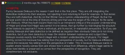 >>2548881I need to revisit Difference & Repetition, so I don't want to overstate any takes about the man. I will say that his work–particularly with Guattari–needs to be thoroughly contextualized within the postwar French moment. People who act as though his work can be easily transposed onto the contemporary scene really deeply misunderstand him. This user's take, however, seems completely, deeply accurate to me–although it's worth noting that Deleuze himself likely would have disagreed with it himself (to say nothing of Foucault).