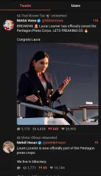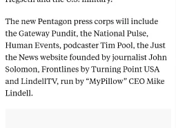 >>2549391These are the other pentagon reporters. Fox news is banned, AP, REUTERS. Nyt, newsmax, ABC and more