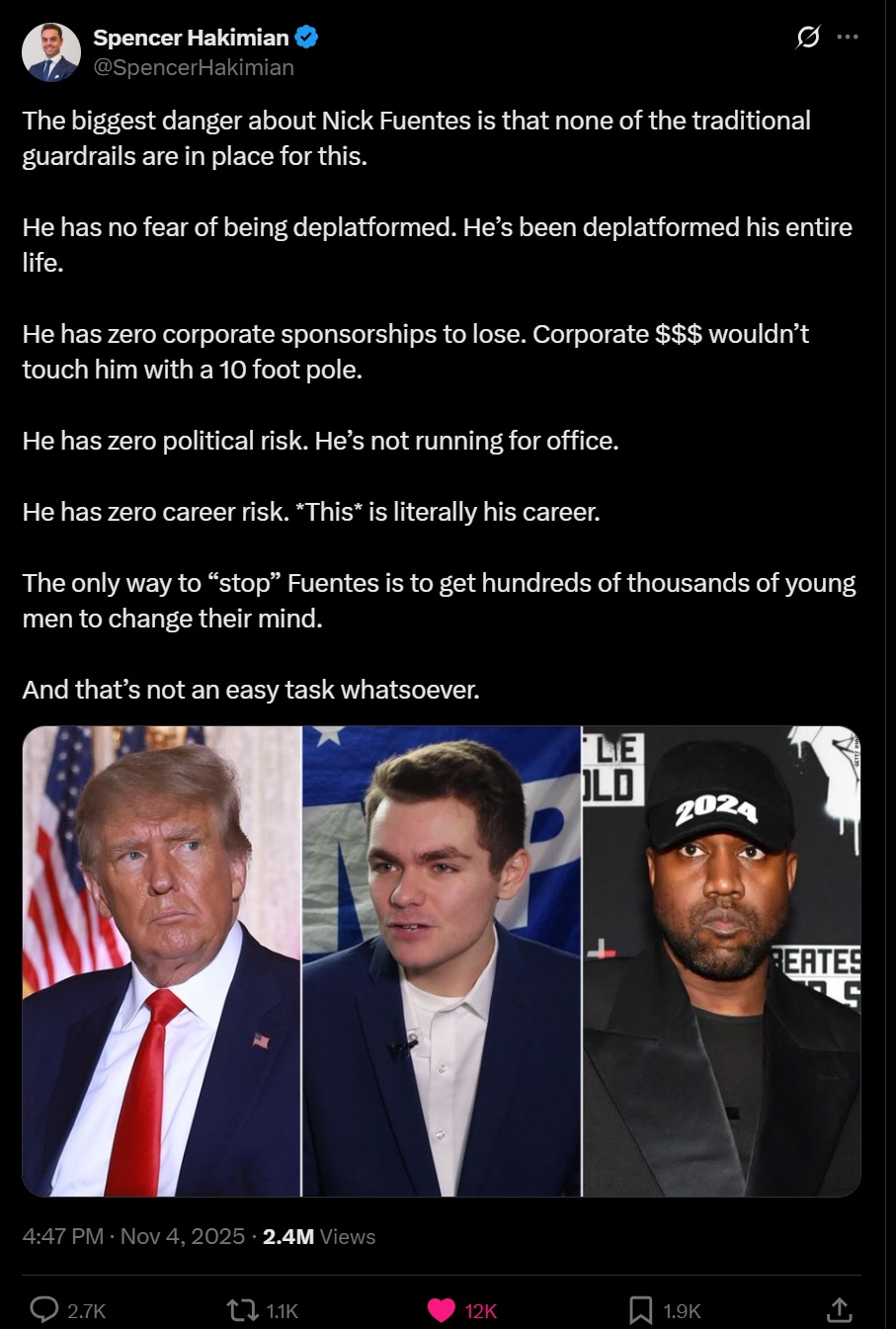 fuentes has no ideology and leads you to nowhere, his whole schtick is being transgressive for attention and money
