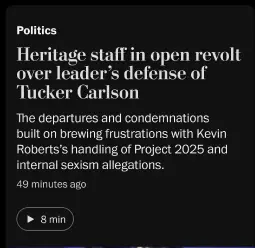 >>2551537>Some staffers defended Roberts and pushed back against his critics. One wanted to know what would happen to those who agreed with Roberts and Carlson, and another likened employees talking to reporters to “Judas.” Roberts’s speechwriter, Evan Myers, suggested that Heritage’s attempts to address accusations of antisemitism would eventually mean he would be required to attend a Shabbat dinner, which he said would conflict with his faith.