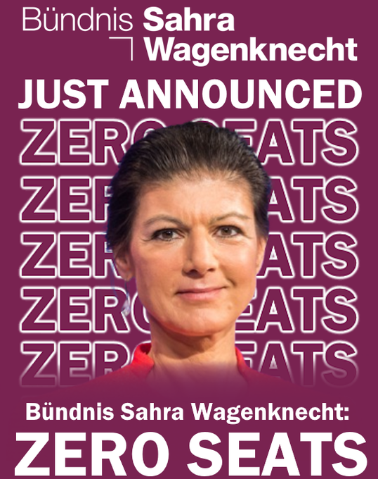 >they certainly overestimated their chances to attract Linke, SPD and AfD votersThe people she is attracting do not exist anymore (socially conservative leftists). A mirage induced by being on the media bubble and constant flattery from far-right figures. They only needed her to browbeat Linke as too radlib, nothing more.