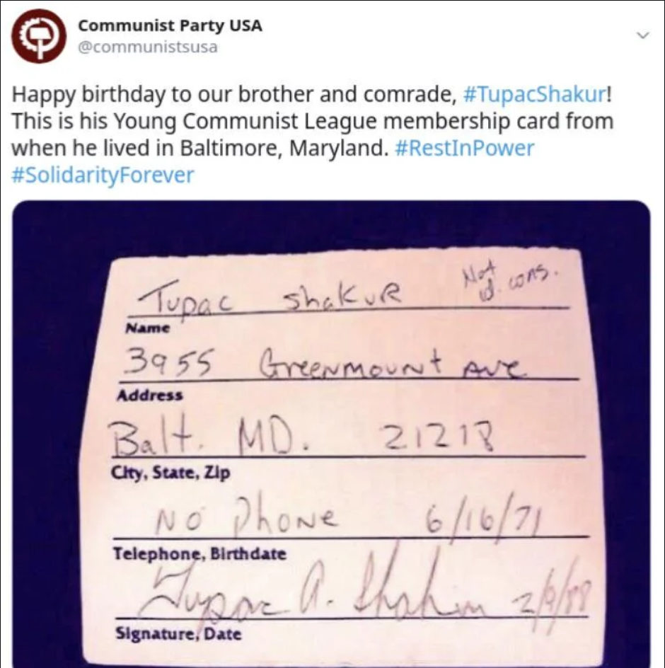 >Hard to say because all of 2Pac's songs are GOATed, but this is a strong contender imo. Proof that this idiot is a troll (as if you needed more) and that not all hip hop is "evil and violent". 2Pac was a Youth Communist btw.And lmao how do you drop the perfect fucking example? LMAO I just heard them talking about this on NPR the other day. The guy was talking about how Tupac was a strictly woke rapper, not from any kind of gang background. Then Suge Knight, a criminal scumbag entreprenour took him under his wing and pushed him into this "Thug Life" persona. And the idiot Tupac took it so far he got himself murdered over the stupidest little interaction.
