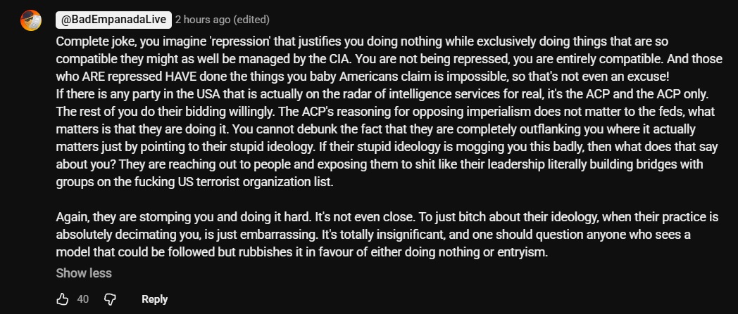 >>2557659I’m not taking lessons on revolutionary praxis in the 21st century imperial core from a guy who makes his money stirring shit on a computer in a comfy chair all day