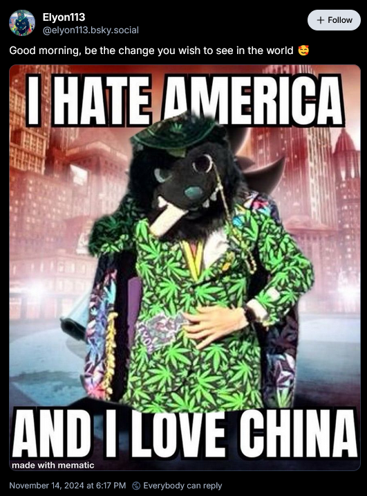 >>2557945>China is le Israel because their culture isn’t a cosmopolitan degenerate parody of itselfHoly shit the absolute state of this board. This place really is just a Bluesky colony, nothing but a collection of social rejects from the west who think communism is some massive drug fueled orgy and relentlessly support the strengthening of their Reich at the expense of the periphery. Unapologetic liberalism reigns supreme
