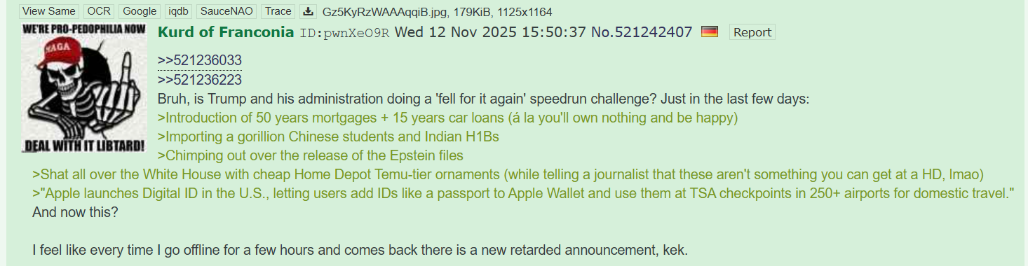 <Trumpian Empire EditionThread for hellish discussion of the Dying Burger Reich: Things are going to continue to happen in the stupidest ways possible that no one really takes seriously, where every single person compulsively reacts with either cynical grifting or useless panic and appealing to a political system of liberal democracy that is entirely dead and irrelevant. things will continue to get gradually worse, more people will lose their jobs and homes, the most destitute and marginalized will be oppressed by state-backed domestic terrorism, but the decay will simply continue and everyone who isn't actively being imprisoned and forced into slavery or outright exterminated will simply ignore it and maintain a cognitive dissonance of believing a civil war is happening while living their lives in a mostly normal fashion. The death of the United States will be slow, painful, and insufferably annoying and stupid. 🏈 💵