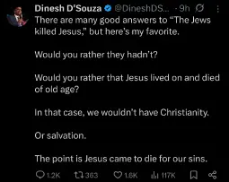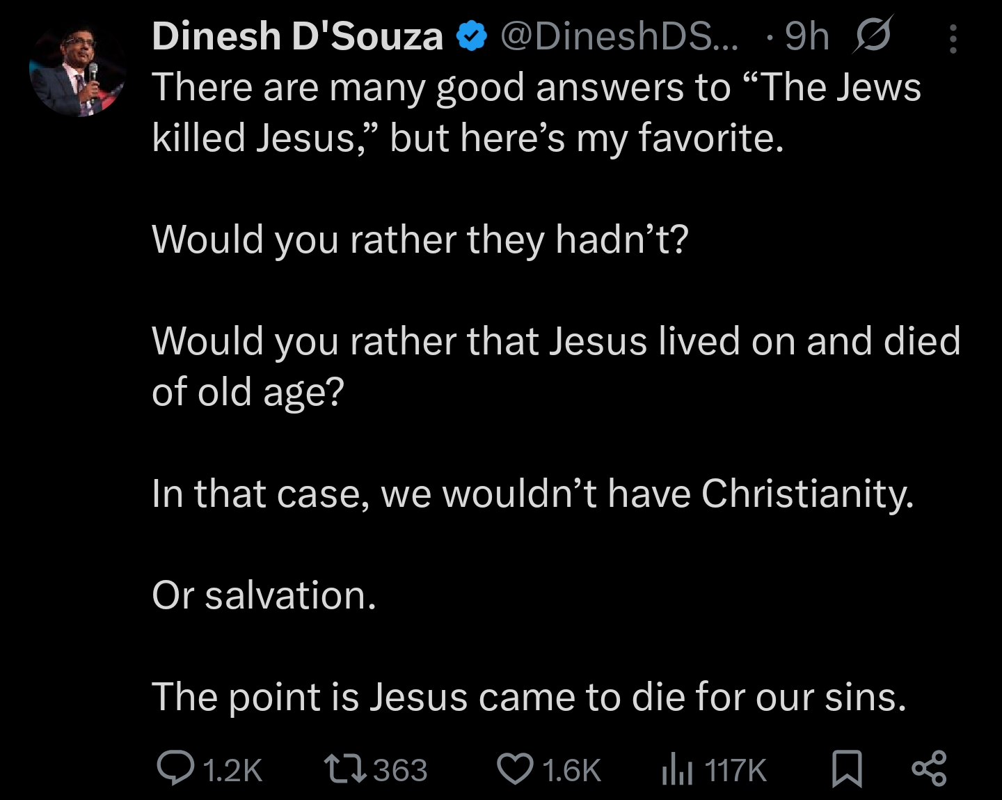 >>2558595>"The Jews killed Jesus but we should be grateful for that."Y'know, on the topic of Jesus' death there's been lots of hot takes. The Muslims believe he was replaced with a criminal on the Cross by Allah (some theories positing it was Judas who took his place). The Gnostics believed that his death on the cross was to show the meaninglessness of matter and how the spirit can survive despite that. A common argument is that it was really the Romans that killed Jesus. But "be grateful for the Jews for killing Jesus" truly is one of the takes of all time.
