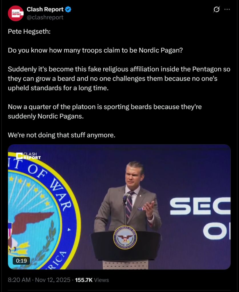 >"Suddenly it's become this fake religious affiliation inside the Pentagon so they can fuck nubile twinks and trans women, and no one challenges them because no one's upheld standards for a long time.""Now a quarter of the platoon is oiling up boi-titties because they're suddenly Hellenic Pagans."