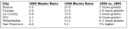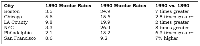 Despite these dreadful conditions violent crime was low, especially in the big cities of the Northeast. Here are the murder rates (per 100,000) in 1890 for six cities. For comparison, consider the murder rates (per 100,000) in these same cities one century later.
