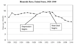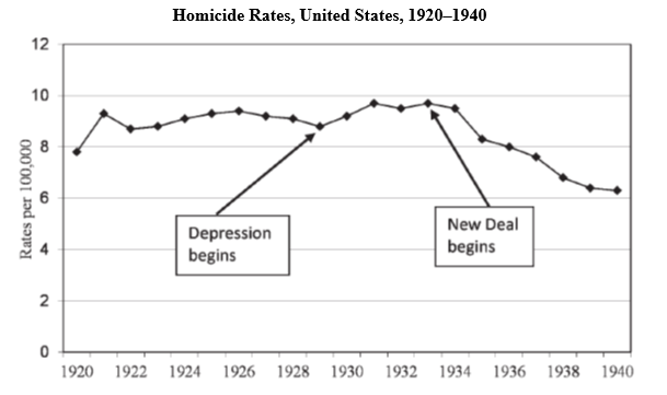 The Great Depression of the 1930s underscores the inconsistent relationship between violent crime and the economy. Murder rates had been hovering around 9 per 100,000 when the Crash of 1929 occurred. These rates rose even further in the early ’30s, the worst years of the Depression. By 1932 an estimated 28 percent of the nation’s households, containing 34 million people, did not have a single employed wage earner. The economy began to improve after 1934 and voila! Crime fell off sharply. This suggests that economic improvement reduces violent crime. But . . . there was a major economic downturn in 1937–38 (the “Roosevelt Recession”)—nearly four million people lost their jobs, boosting total unemployment to 11.5 million—and despite this recession within the Depression, violent crime continued to decline.