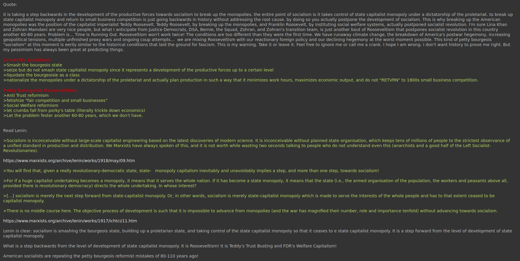 >>2559869The biggest problem I see with revolution is just getting enough people to go along with it and organizing them successfully. I don't think a revolution will just spontaneously happen because things are bad, and there will always be figures attempting to dissuade people from the revolution or instead arguing for concessions.