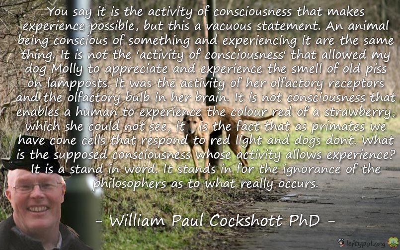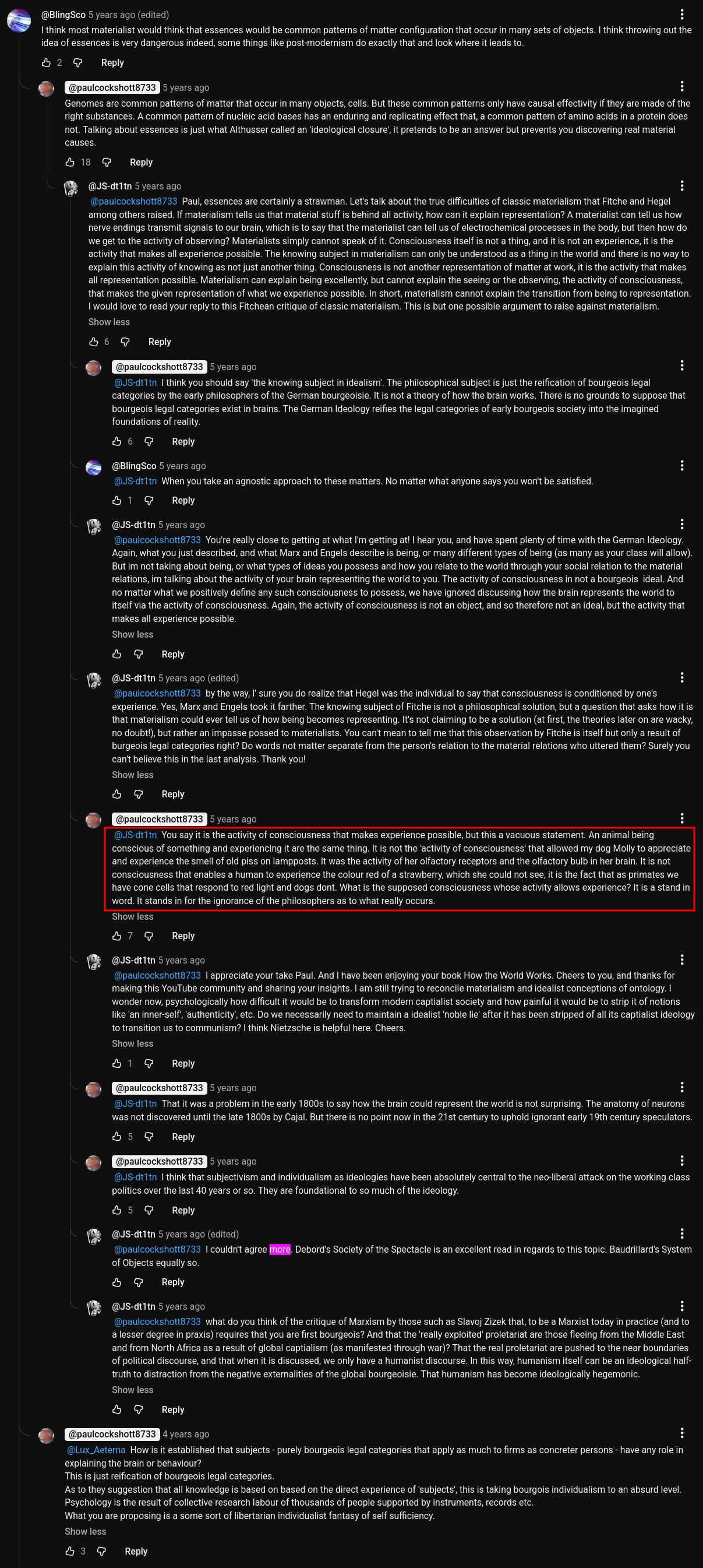 https://www.youtube.com/watch?v=Kjja-oNyfdI&lc=UgyUuExX9DapVDDvegF4AaABAg.9M9DRCgtIyh9MCmVc8AyBH >>2793339There is a profound irony in watching Paul Cockshott argue on Big Tech plattforms like Youtube or X. Here is a man who built his reputation as a Marxist cybernetician, an advocate for computational planning, feedback loops, and the scientific control of economic systems, reducing consciousness to the firing of olfactory receptors and the mechanical response of cone cells. In the screenshot, he insists that experience is not the “activity of consciousness” but the brute material fact of “the activity of her olfactory receptors and the olfactory bulb in her brain.” Consciousness itself, he declares, is a “vacuous statement,” a mere “stand-in word” that papers over the ignorance of philosophers who refuse to accept that primates see red simply because they have the right photoreceptors.