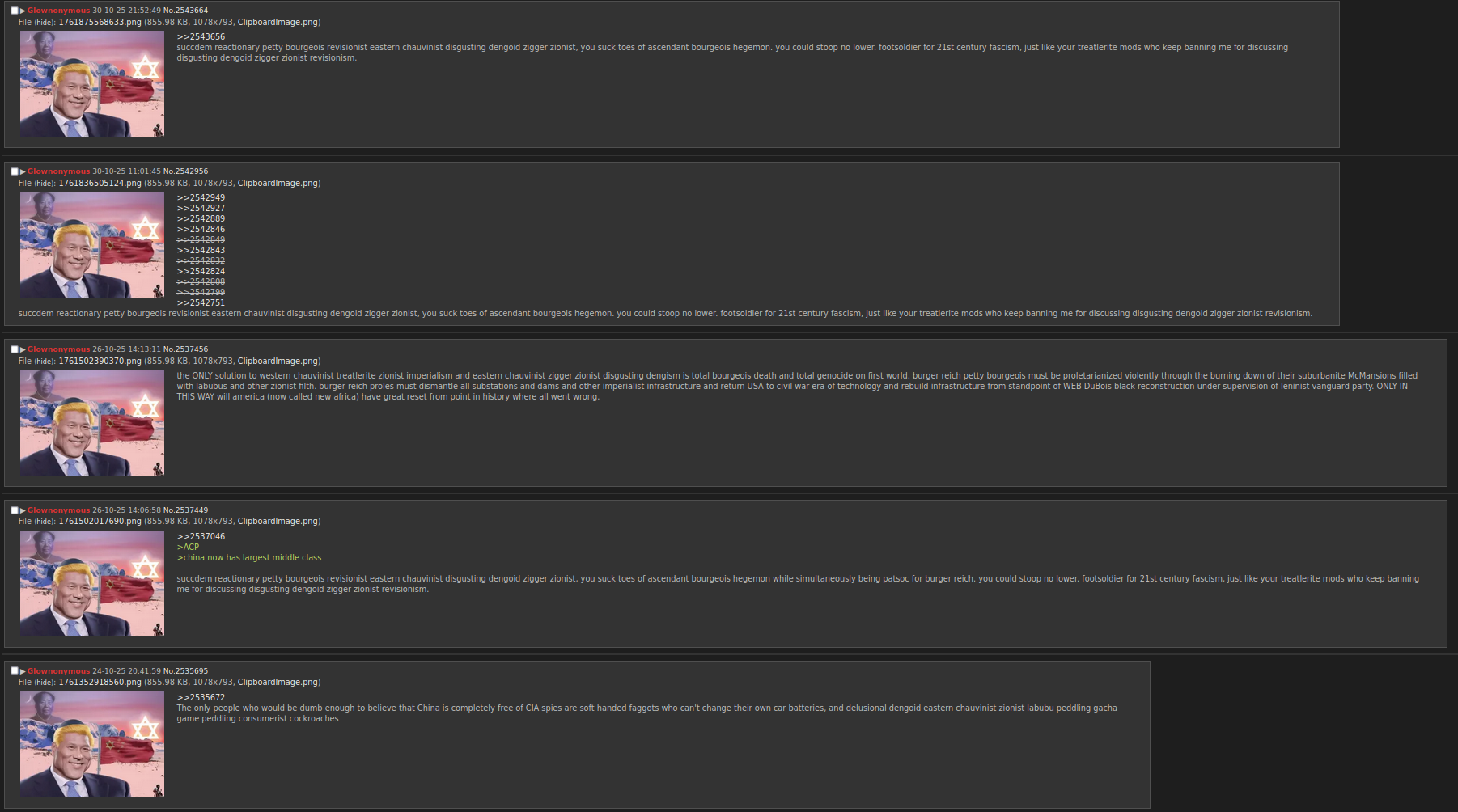 >>2567948>At least take your complains to /prc/ where it's on topic.It's you retards bringing your irrelevant China glazing here as if that's some kind of dunk on the US. yes, wow China has now arrived at the stage of capitalism the US was at after WW2. I'm happy for Chinese people who benefit from this, but please don't lose sight of winning victory for the working class like we did.