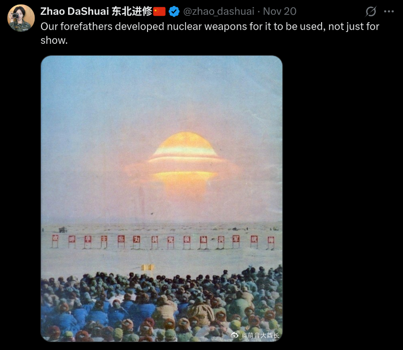 >>2570483That and there is the fact that the Japanese PM that was just elected is a complete nutcase NATO-fascist who denies warcrimes even more aggressivley than the average Japanese politician (which is a high fucking bar). So I honestly think this is China posturing and signalling to Japan that electing someone who rabbidly hates China will only make the Chinese more steadfast.