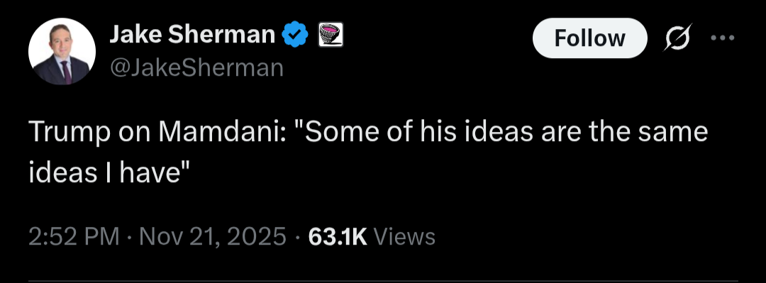 >TRUMP showering praise on Mamdani in the White House may throw House Republicans for a loop. The House GOP has signaled their entire 2026 campaign plan is to tie Democrats to Mamdani