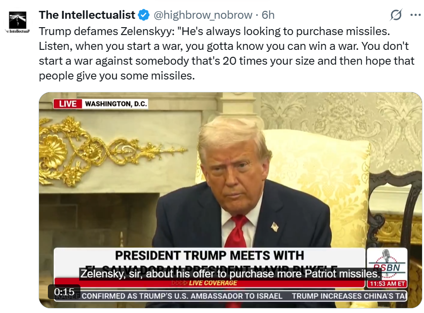 >>2571648>The current “Peace Negotiations” are a Kabuki theatre that will result in Trump refusing to force a Ceasefire Bruh, I'm not reading all that post, but I agree with this. We heard that he was threatening a Thursday deadline red line, and now he's already walked back the seriousness of that when talking to the press. The sole objective is to soften Russia's approach and buy Europe time (what Europe can be expected to do is another discussion entirely) by playing toward Putin's hard-on for negotiations and legal wrangling. It's no coincidence that the Russian military is at its most effective during lulls in diplocuckery.