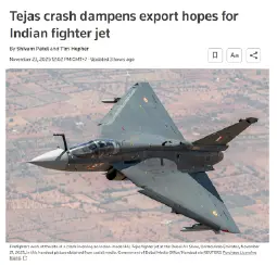 >The crash of India's Tejas fighter in front of global arms buyers at the Dubai Airshow is the latest blow to a key national trophy, leaving the jet reliant on Indian military orders to sustain its role as a showcase of home-built defence technology.