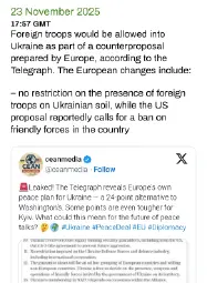 >Keir Starmer is set to meet Ukraine’s allies at the Johannesburg G20 summit on Saturday to seek to “strengthen” the US-drafted plan. “Ukraine’s friends and partners will meet in the margins of the G20 summit to discuss how we can secure a full ceasefire and create the space for meaningful peace negotiations,” he said. “We will discuss the current proposal on the table, and in support of President Trump’s push for peace, look at how we can strengthen this plan for the next phase of negotiations.”