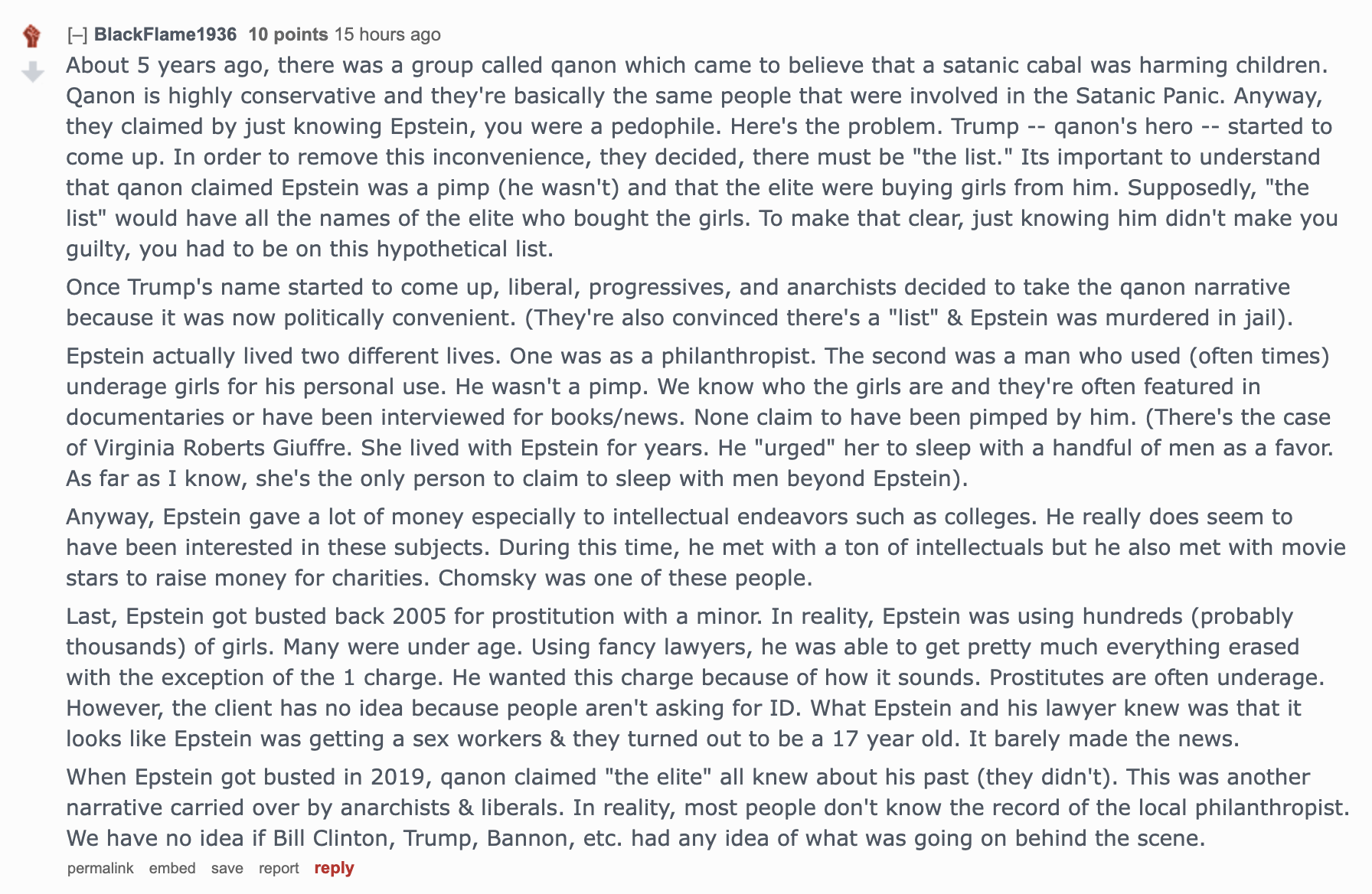 >>2615335The fact Chomsky was friends with a known convicted pedophile and billionaire is enough for me to believe this is not a nothingburger but a very real somethingburger.