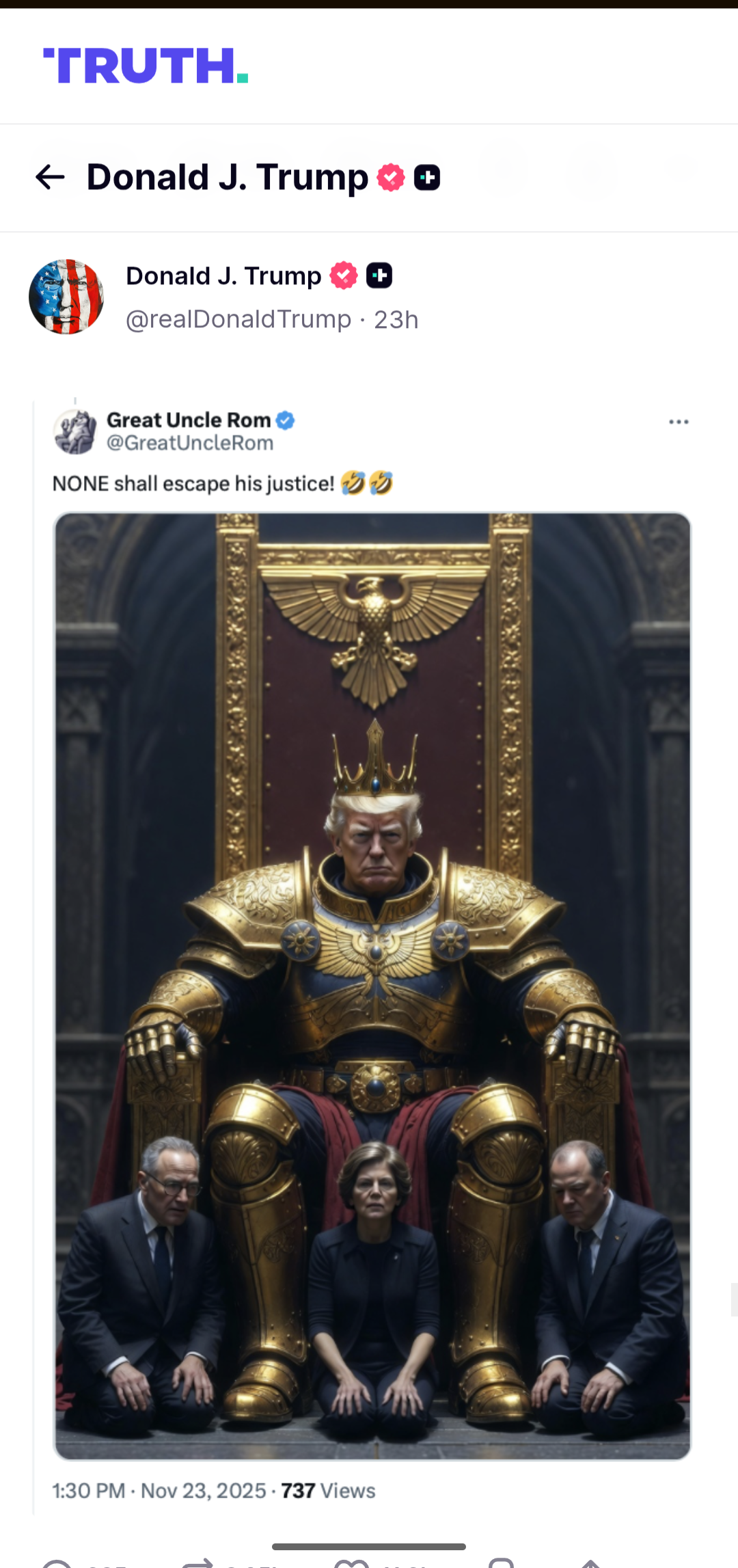 >Things are going to continue to happen in the stupidest ways possible that no one really takes seriously, where every single person compulsively reacts with either cynical grifting or useless panic and appealing to a political system of liberal democracy that is entirely dead and irrelevant. things will continue to get gradually worse, more people will lose their jobs and homes, the most destitute and marginalized will be oppressed by state-backed domestic terrorism, but the decay will simply continue and everyone who isn't actively being imprisoned and forced into slavery or outright exterminated will simply ignore it and maintain a cognitive dissonance of believing a civil war is happening while living their lives in a mostly normal fashion. The death of the United States will be slow, painful, and insufferably annoying and stupid. <Death to the scourge of the earth, the destroyer of nations, the father of fascism, the enabler of ethnostates, the treatlerite tyrant, the protector of pedophiles, the exporter of ecocide, the captain of capitalism, the king of coups, the sultan of sanctions, the emir of the embargo, the autocrat of austerity, the doge of deregulation, the baron of busting unions, the prince of privatization, the lord of loan sharks, the patron-saint of proxy wars, the sponsor of settlers, the guarantor of genocides, the invader of islands, the Divided $nakkkes of Amerikkka™ 🛠️ Strike Tracker ⚒️https://striketracker.ilr.cornell.edu/🇺🇸 Deeds of the Burger Reich 🇺🇸https://github.com/dessalines/essays/blob/main/us_atrocities.mdhttps://williamblum.org/essays/read/overthrowing-other-peoples-governments-the-master-list📺 Glowie News 📺(sponsored by the Burger Eagle Freedom Institute (formerly USAID))