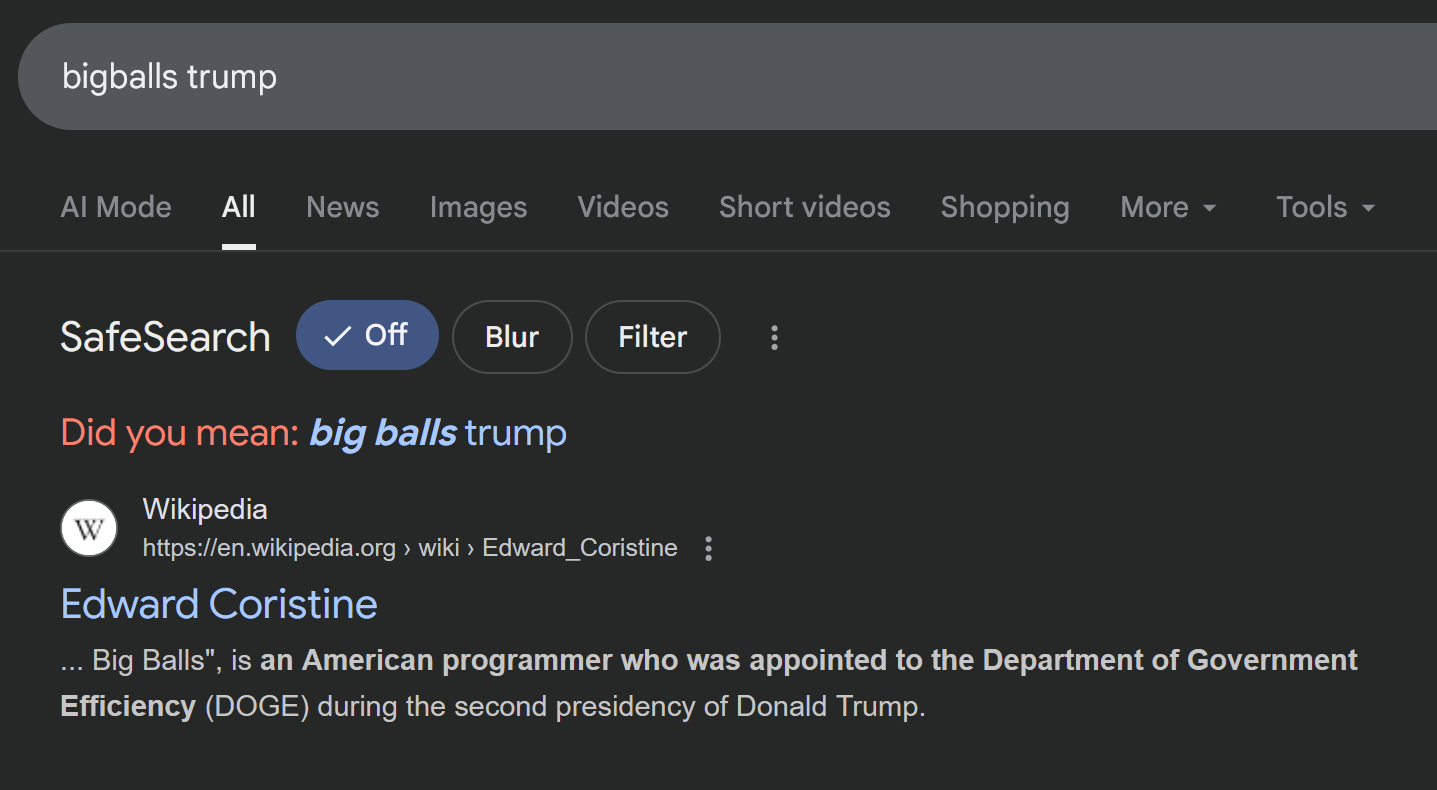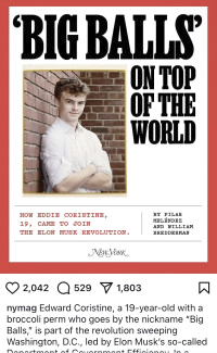 >Coristine graduated from Rye Country Day School in 2024.[6] He acquired the nickname "Big Balls" during a math class in his junior year of high school[1][7][8] and added it to his LinkedIn profile.[9] He enrolled at Northeastern University in 2024 as a mechanical engineering and physics major.[6][10] School friends describe him as intelligent and driven, with Elon Musk being his hero.[11][10] Coristine is a registered Republican.[2] I actually love Jews, even more than White people. They really are the best in the world.