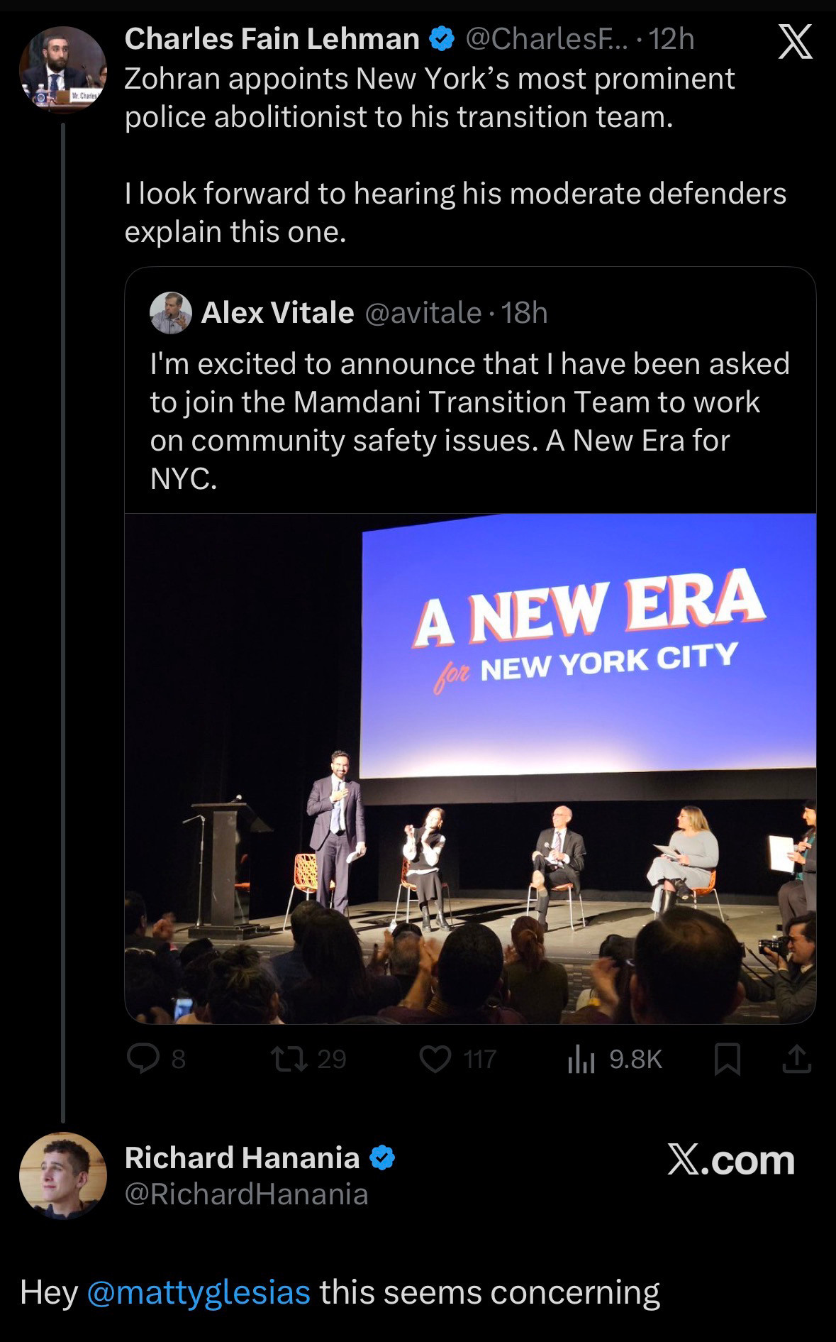 Anyways, contrary to claims that he is backsliding into liberalism it appears Zohran has appointed a staunch police abolitionist to the transition team. The libs are not happy with this development, because without police who else is going to brutally crack down on people protesting outside stolen Gazan real estate auctions?