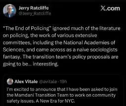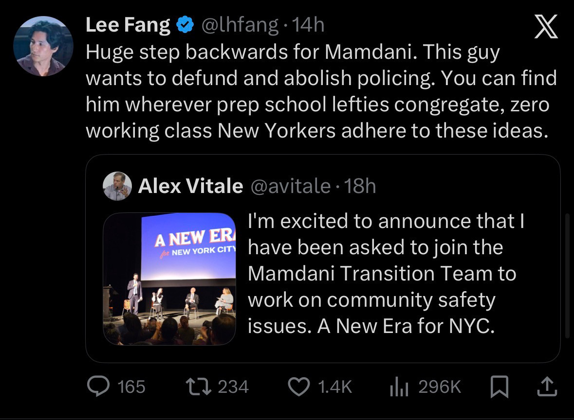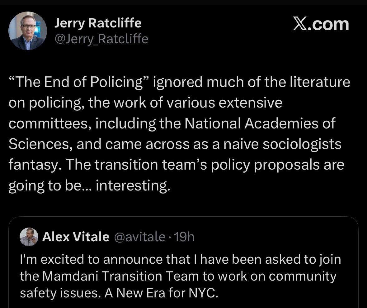 But yes, Alex Vitale is a straight up police abolitionist, mega based, hated by libs, considered a scourge of humanity by Ted Cruz. Great guy all around. After the whole fiasco with retaining the police commissioner this gives me a little more hope that Mamdani actually means what he says