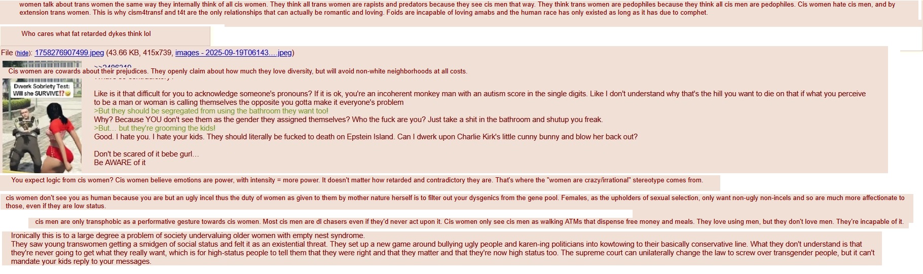 But brazen fucking misogny can't be seen by the same poster who believes that Women are just jealous of being "mogged" by transhumanists.
