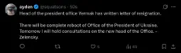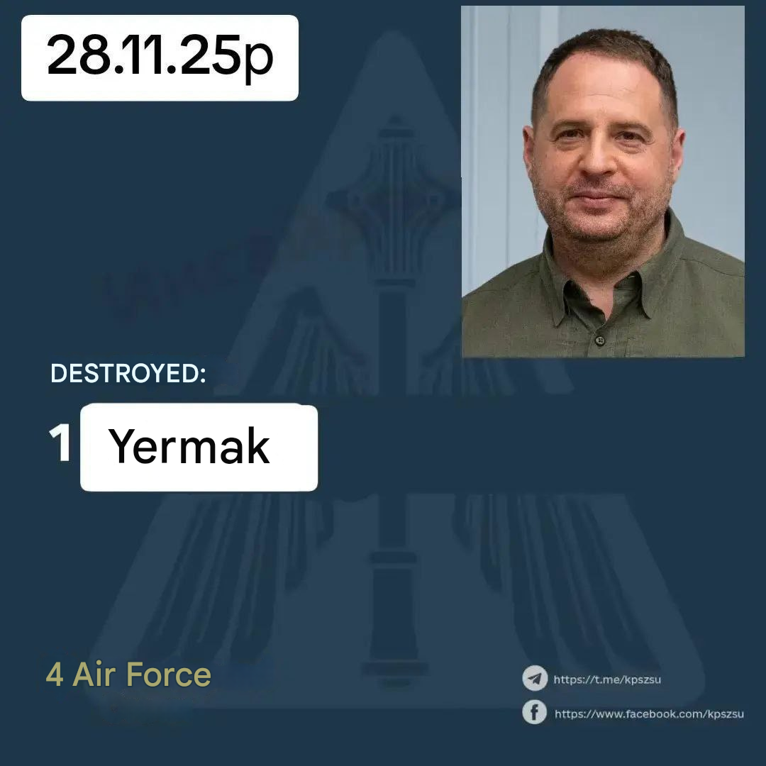 >Breaking: The Ukrainian outlet Ukrainska Pravda reports that NABU and SAP are conducting searches targeting Presidential Office head Andriy Yermak in the government district on the morning of 28 November