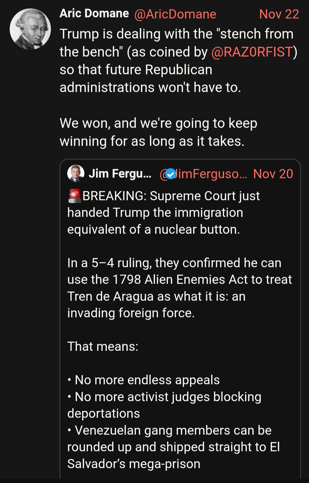 >Things are going to continue to happen in the stupidest ways possible that no one really takes seriously, where every single person compulsively reacts with either cynical grifting or useless panic and appealing to a political system of liberal democracy that is entirely dead and irrelevant. things will continue to get gradually worse, more people will lose their jobs and homes, the most destitute and marginalized will be oppressed by state-backed domestic terrorism, but the decay will simply continue and everyone who isn't actively being imprisoned and forced into slavery or outright exterminated will simply ignore it and maintain a cognitive dissonance of believing a civil war is happening while living their lives in a mostly normal fashion. The death of the United States will be slow, painful, and insufferably annoying and stupid. <Death to the scourge of the earth, the destroyer of nations, the father of fascism, the enabler of ethnostates, the treatlerite tyrant, the protector of pedophiles, the exporter of ecocide, the captain of capitalism, the king of coups, the sultan of sanctions, the emir of the embargo, the autocrat of austerity, the doge of deregulation, the baron of busting unions, the prince of privatization, the lord of loan sharks, the patron-saint of proxy wars, the sponsor of settlers, the guarantor of genocides, the invader of islands, the Divided $nakkkes of Amerikkka™ 🛠️ Strike Tracker ⚒️