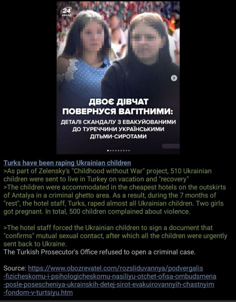 Ukrops think that Russia is genociding Ukrainian children. Russia, however, merely evacuated children from the frontlines, and since they are now Russian citizens living in dangerous territories, they got priority admission into all kinds of tourist/rehabilitation facilities in Russia - which usually have some kind of patriotic educatio/programs (aka they call Bandera a Nazi war criminal)