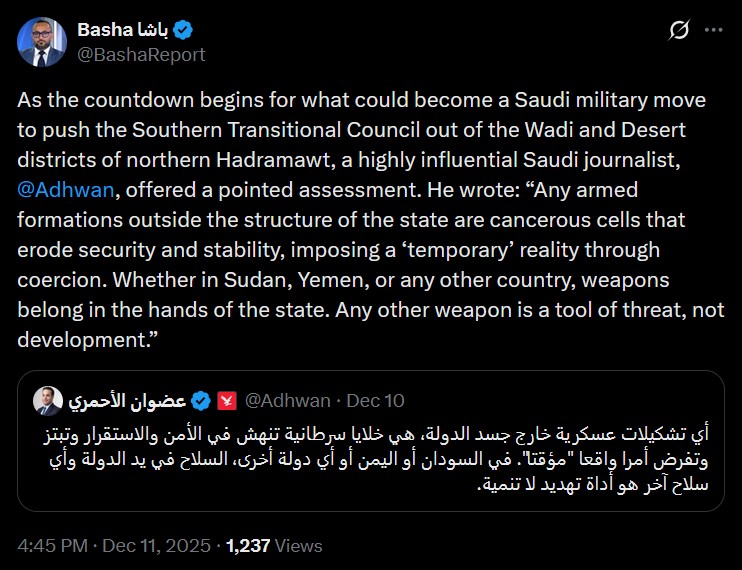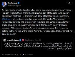>The president of the Southern Transitional Council said all the conditions were in place for statehood and added that secession would allow the south to make its own foreign policy decisions, including the option of joining the Abraham Accords.