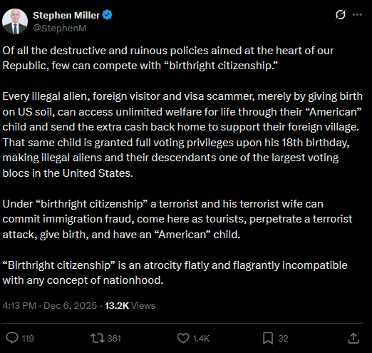 >>2586184If Birthright citizenship is no longer applied then it's not just your parents who are under scrutiny. If your parents' parents weren't citizens then they retroactively weren't citizens either. Even one illegitimate ancestor means you are not a citizen. And how many Americans can prove all their grandparents were natural born citizens, never mind all their great-grandparents?
