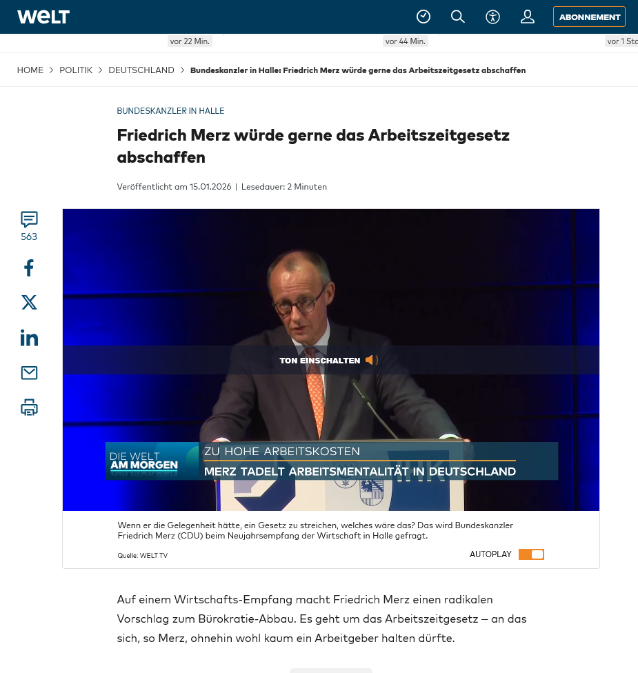 >Bereits im Koalitionsvertrag hatten CDU, CSU und SPD vereinbart, die Möglichkeit einer wöchentlichen anstatt einer täglichen Höchstarbeitszeit von derzeit acht Stunden zu schaffen, um die Flexibilität zu erhöhen. Die Regierungspartner haben zudem eine unbürokratische Regelung zur elektronischen Arbeitszeiterfassung sowie Steuererleichterungen für Mehrarbeit vereinbart.>das SPD-geführte Bundesarbeitsministerium will bereits in den kommenden Monaten einen ersten Entwurf für Änderungen bei den gesetzlich geregelten Arbeitszeiten vorlegen. Ein Referentenentwurf sei bereits für das erste Halbjahr 2026 geplant, teilte das Haus von Bärbel Bas mit. Sie ist Co-Chefin der Sozialdemokraten.Wenn Sozialfaschisten in der Regierung sind braucht man keinen Merz, Söder, Linnemann usw. Die Husos verarbeiten das Proletariat selber zu Geschnetzeltem für den Hauptgang im Menü des Bürgertums.