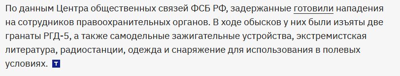 >Preparation for violent seizure (attempted violent overthrow) of power — often reported as ч.1 ст.30 + ст.278 УК РФ (i.e., attempt + article on violent seizure of power). Reporting shows investigators say the group “prepared” for a forceful change of the constitutional order.>Crimes connected with weapons / explosives — reported counts include attempted theft/extortion of weapons or preparation to obtain weapons/explosives (references in reporting to parts of ст. 226 and/or ст. 222.1 for illegal acquisition/storage of explosives). The press pieces cite the prosecution’s version that defendants prepared or planned acquisition of weapons/explosives. (See Russian Criminal Code articles for these offenses: art.226 (theft/extortion of weapons) and art.222.1 (illegal handling of explosives).)https://www.kommersant.ru/doc/5281180they explicitly stated, when questioned by the police that they planned to: "waiting for an unstable situation to seize power, to kill police and politicians", "seizing weapons and attack law-enforcement".