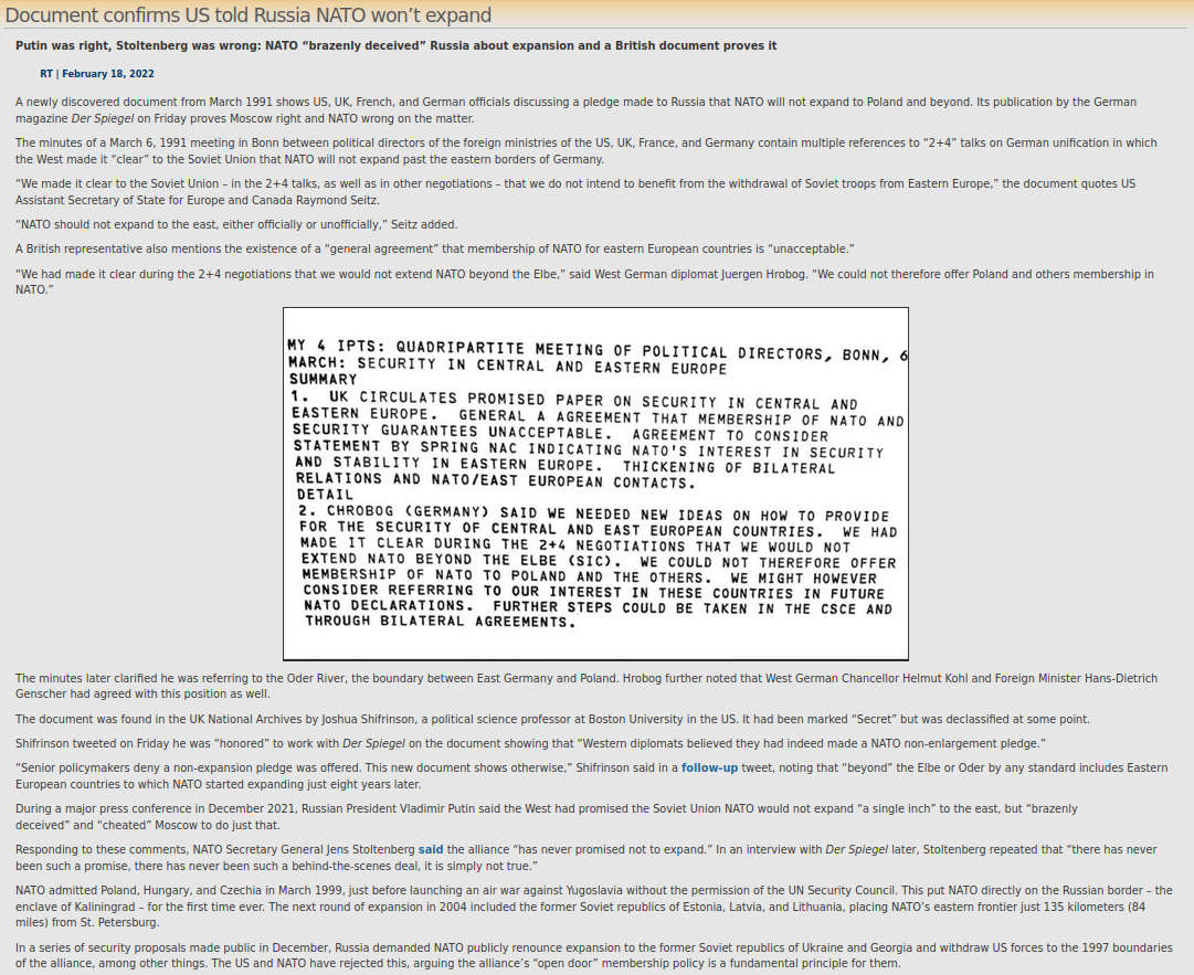 >The eastwards expansion of NATO and the EU in breach of documented pledges to ex-President Gorbachev and ex-Foreign Minister Shevardnadze; NATO’s military build-up in eastern Europe and the Baltic states and in the seas and oceans around Russia; the US- and fascist-backed coup to replace Ukraine’s democratically elected president by pro-Western politicians in 2014; the unpunished massacre at the Odessa trade union HQ; the refusal of the Ukrainian government to implement the UN-backed Minsk II Agreement including autonomy for the Donbas region; and in recent days – as recorded by observers from the Organisation for Security and Cooperation in Europe (OSCE) – the escalating attacks on the ‘People’s Republics’ in Donetsk and Lugansk … all have created the conditions for today’s war.