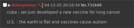 >>2587572Cuba is too smart. It needs to be bombed and regime changed so it can be dumb dumb like me