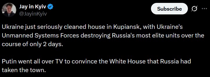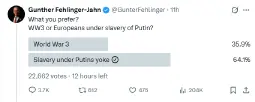 Putin likely is just larping. I'm more concerned that there's hardly anyone to follow on social media for war updates without getting a bunch of traddy chuddy shit thrown into the mix from MyLordBebo, Olga, etc.