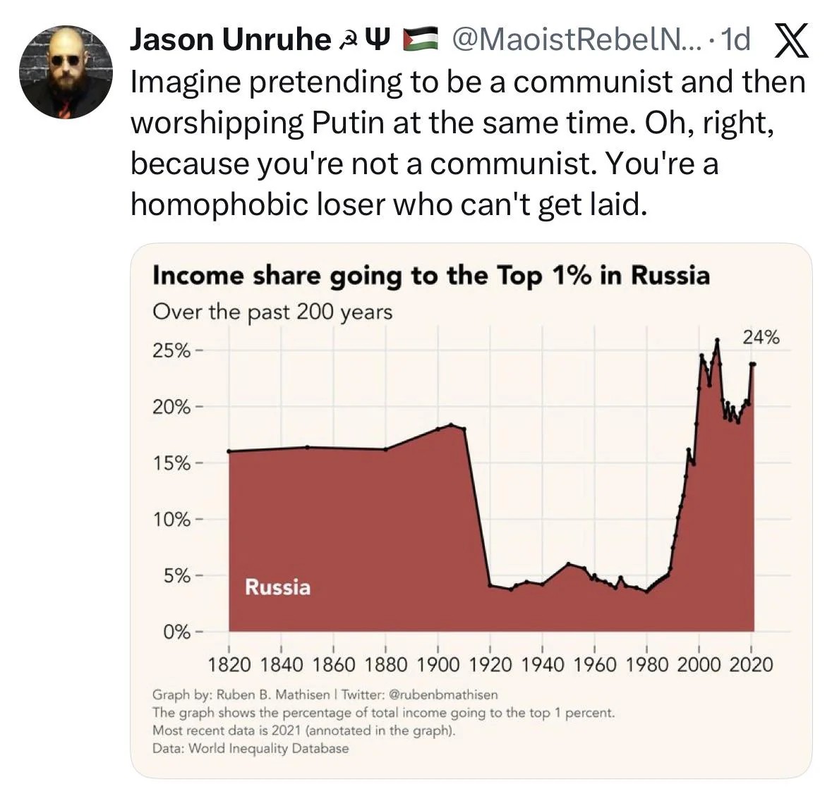 You also can't be a communist and support Russian blood and soil imperialist conquest and mass kidnapping of children to be put up for sale in Russia.