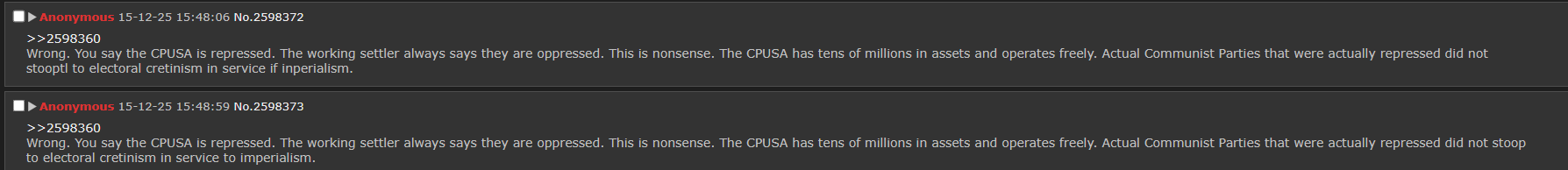>>2598745The possibility of class war vanishes when the supposedly most advanced "worker" party uses all of its tens of millions to dick ride platner. The struggle then devolves into defensive war of survival against genocidal neocolonial fascists.