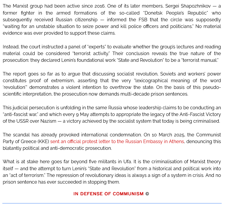 https://eanews.ru/ekaterinburg/20251216144423/chleny-marksistskogo-kruzhka-iz-ufy-poluchili-bolshie-sroki-v-voennom-sude-ekaterinburga 51 posts and 2 image replies omitted.It's actually a good thing when communists get arrested on trumped up charges by a bourgeois state because something something Ukraine. I am very smart.