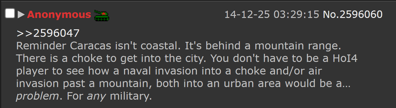 >>2601879I do agree we need to collaborate with other orgs, though its somewhat difficult given there are ultra-left partisans intent on wrecking. I think a war with Venezuela will be a bigger flashpoint than Iraq personally in terms of domestic discontent. Things are already bad, y'know, economically. Adding an expensive war on top of it? People will be pissed. Plus I'm sure Trump wants to use any war as an excuse to cancel elections.