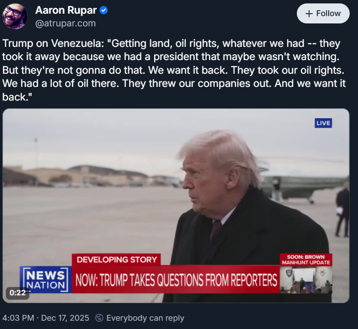 >>2602047I mean Trump already has horrendous polling and hasn't fixed the affordability crisis. He's deeply polarized the country. Starting another "unwinnable" war (especially one more liable to have coffins coming home) and doing it openly on the basis of "we're gonna take the oil" isn't going to win him more support, especially if oil prices don't even go down afterwards.