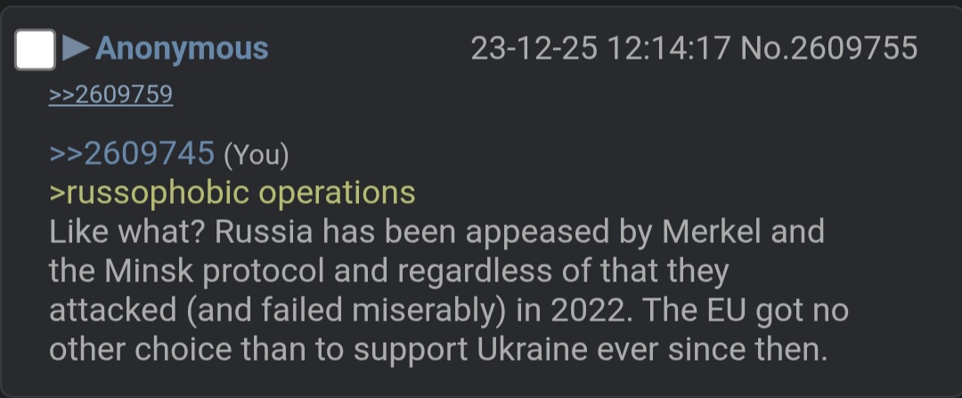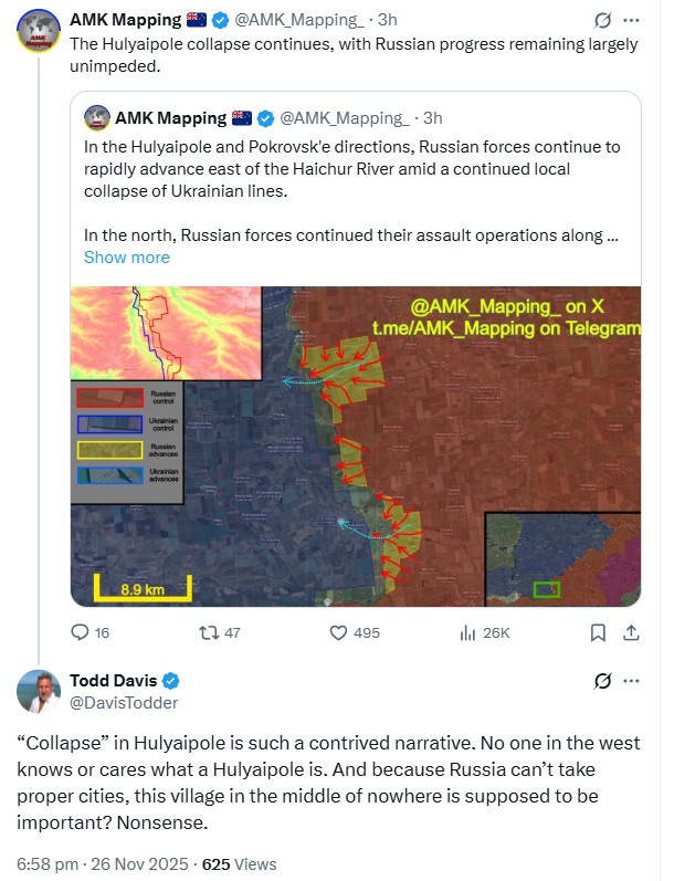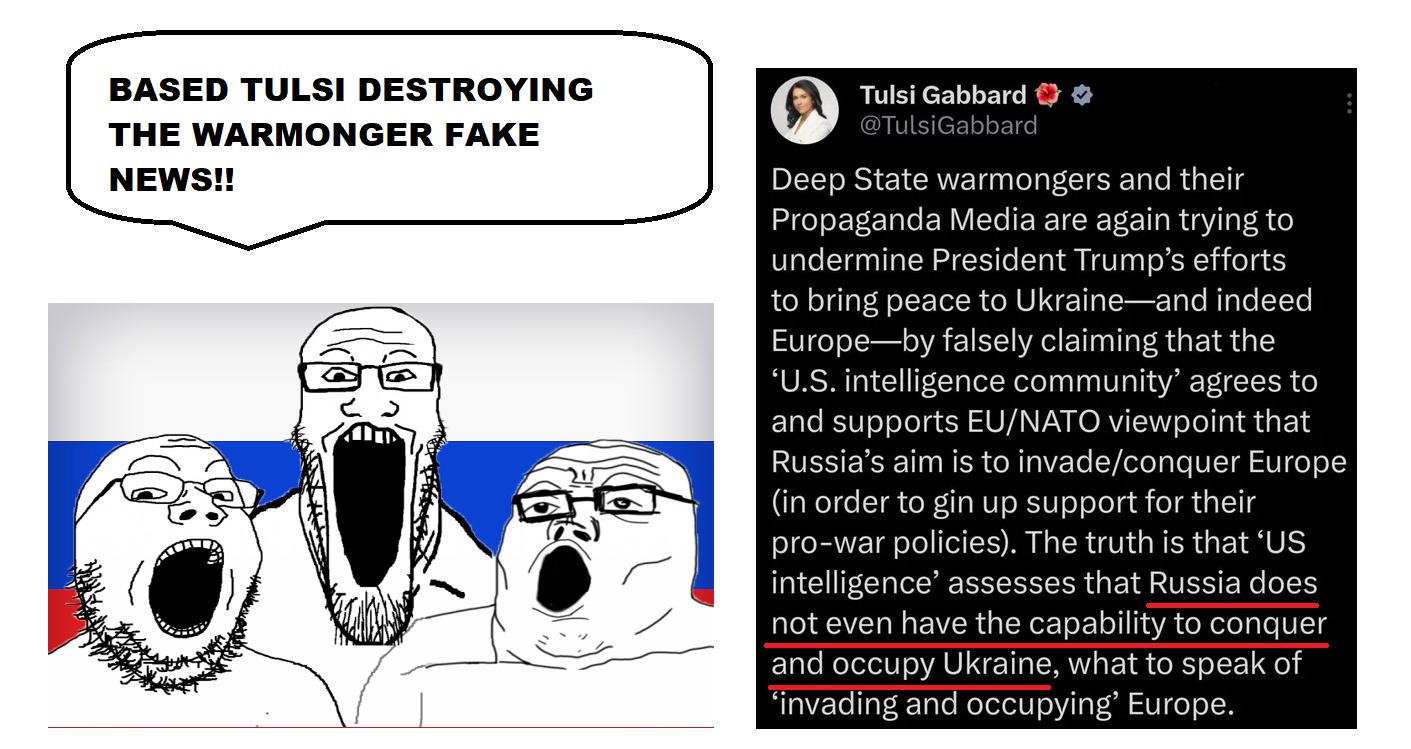 TRVKE: Ukraine obviously is in no way winning, which is why it needs to beg for a ceasefire. Russia obviously is in no way dominant enough to achieve its strategic goals, which is why it's still dicking around in Donbass after the time it took Stalin/Zhukov to finish the Great Patriotic War and why it needs to suck Trump's cock, tolerate his insults, and hope he can gin up some kind of Hail Mary in the absence of Russia's ability to compel a capitulation.